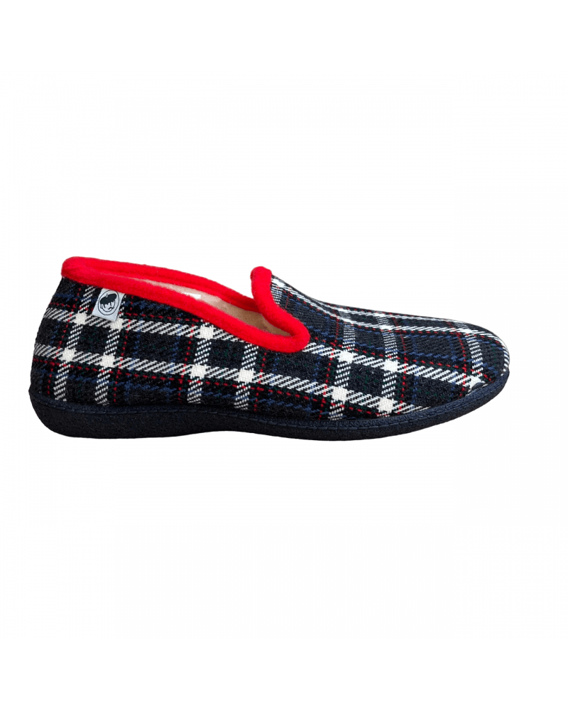 Cette pantoufle est disponible du 39 au 45, en rouge et en marine.